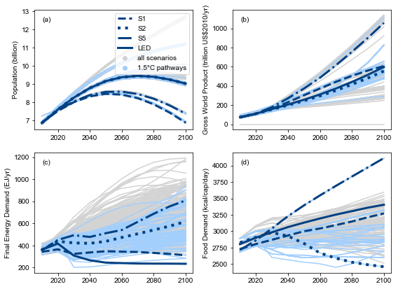 Figure 2.4 of the IPCC SR15, showing the range of assumptions of socioeconomic drivers
